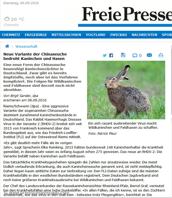 Die Kaninchenkrankheit Chinaseuche (RHDV2) in der Freien Presse am 6.9.2016